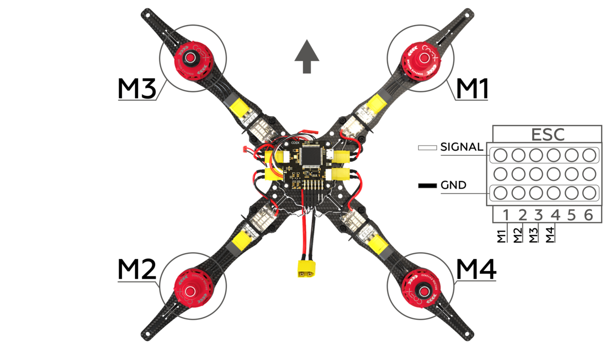 Connect the speed controllers to the flight controller in accordance with the diagram.