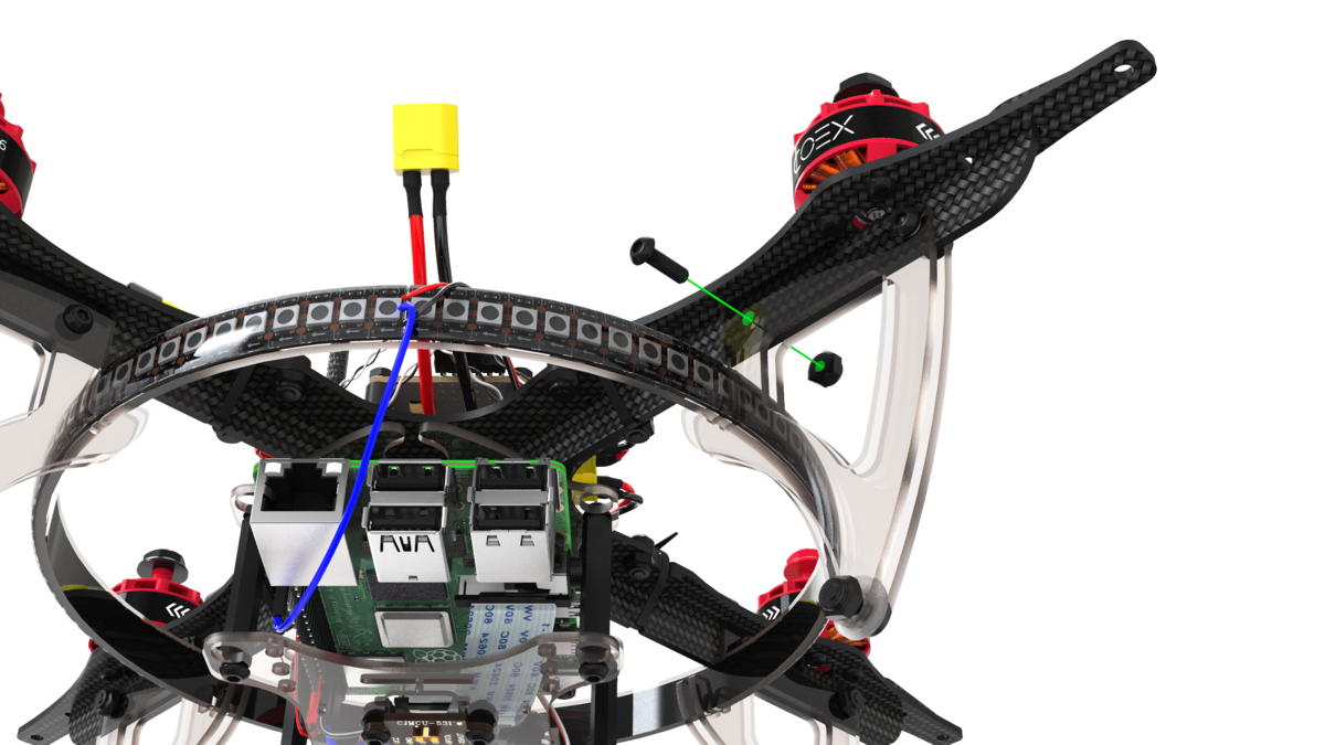 Bend the legs back and install a hoop with LED strip in a special groove on them so that the connection cables exit from the tail side of the copter.