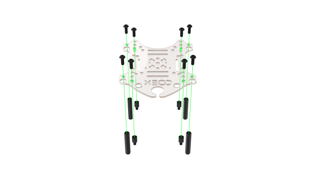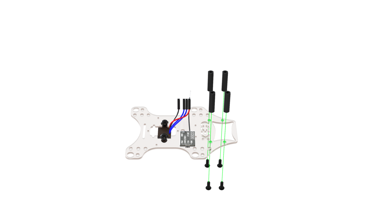 Install 2 aluminum 15mm posts on the center holes in the main deck and fix them with the M3x8 screws.