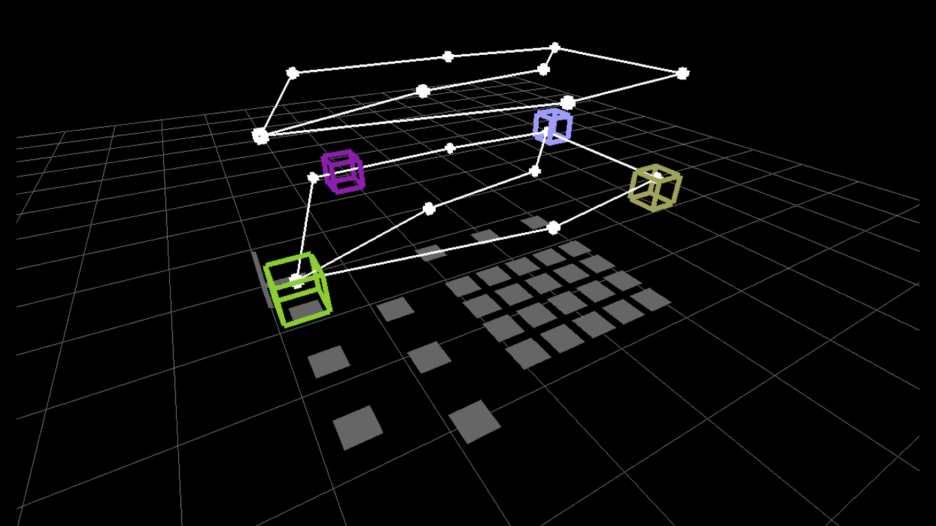 Для наглядности работы системы был разработан 3D-визуализатор воздушного пространства. Он отображает систему эшелонов, поле ArUco-маркеров; позиции коптеров и направления их движения в real-time.