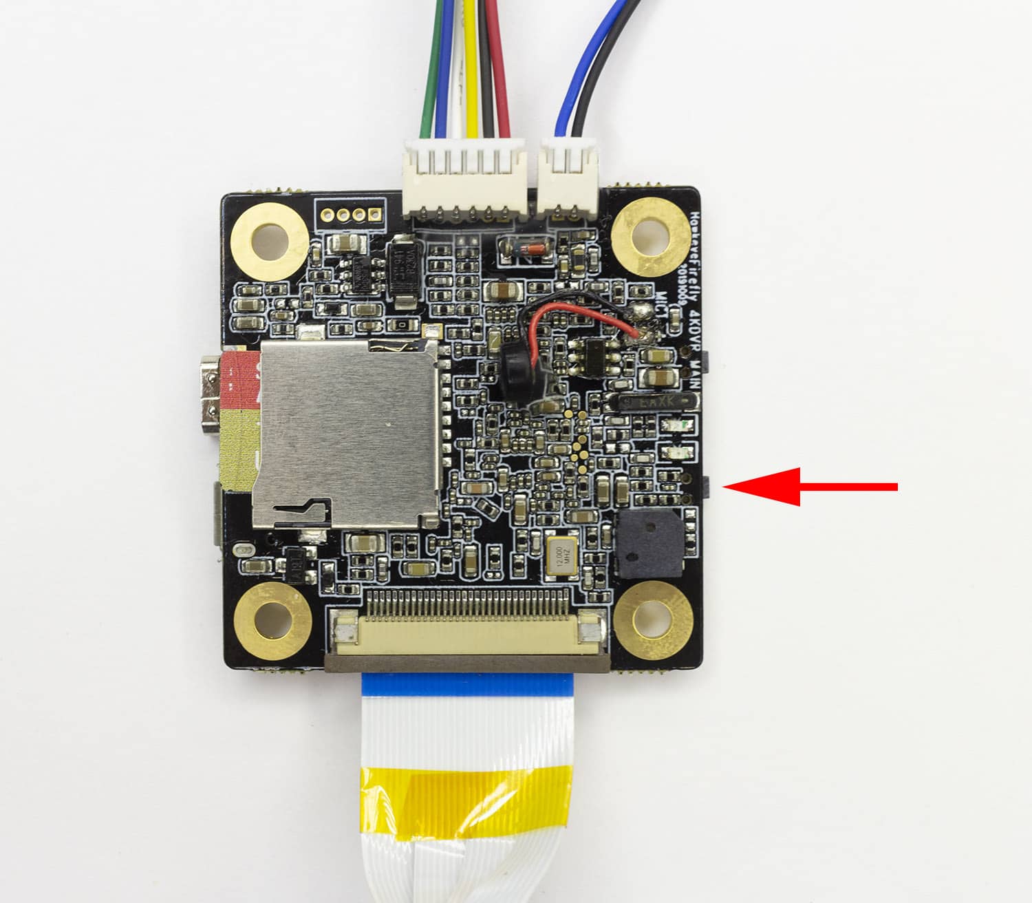 Красный провод необходимо припаять к контакту BAT+ на плате распределения питания (от напряжения 5 воль камера работать не будет), черный провод необходимо припаять к контакту GND.