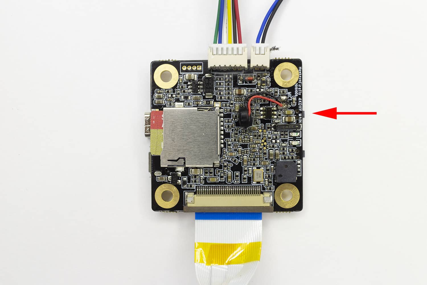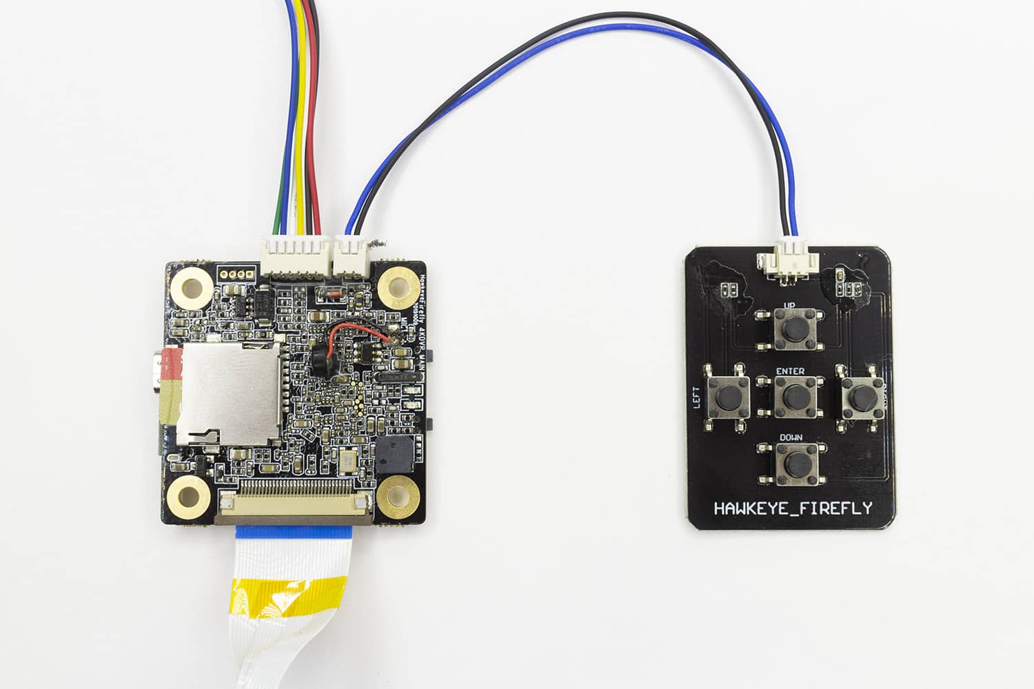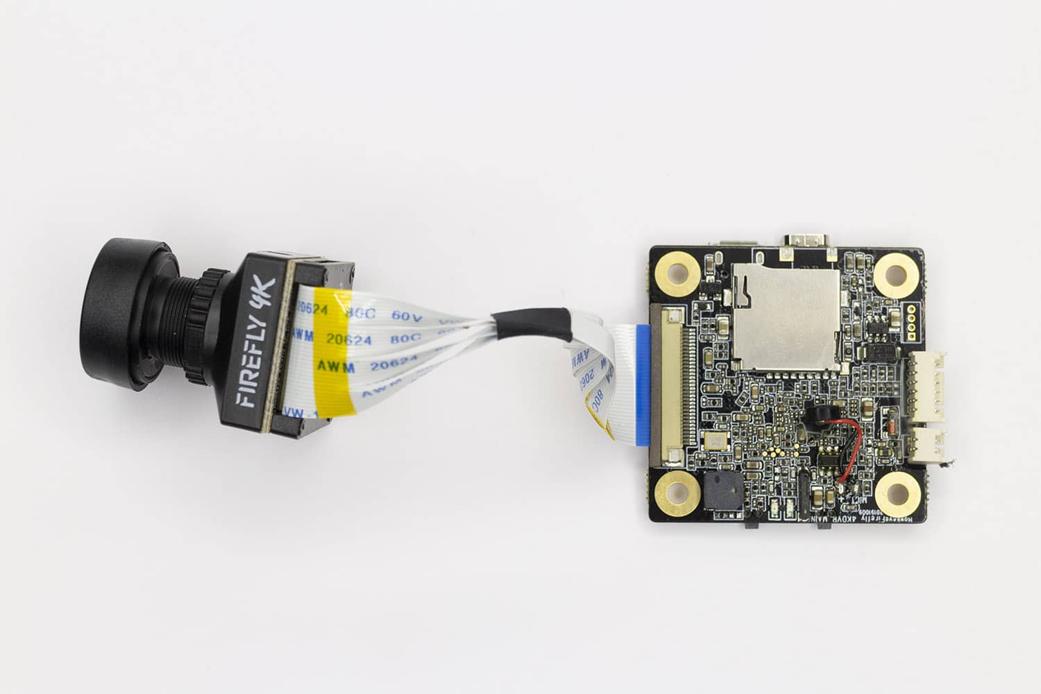 Установите плату на нейлоновые стойки сверху полетного контроллера. Для подключения камеры используйте кабель, идущий в комплекте.