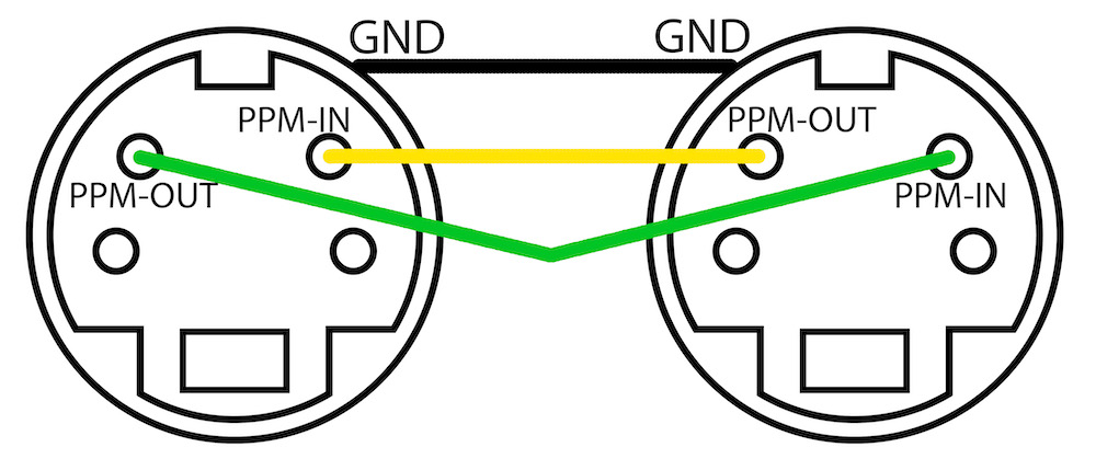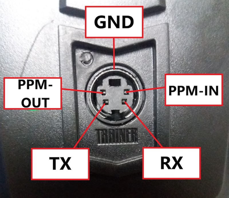 Для создания канала общения между пультами используется разъём сзади корпуса (S-Video). Три контакта в разъёме отводятся для приёма, передачи информации и заземления. Контакт PPM-OUT (передача) должен быть соединён с PPM-IN (приём) и наоборот. Во избежание помех внешней среды контакты ground должны быть соединены между собой.