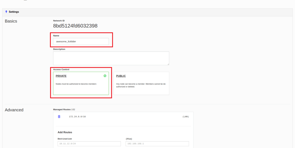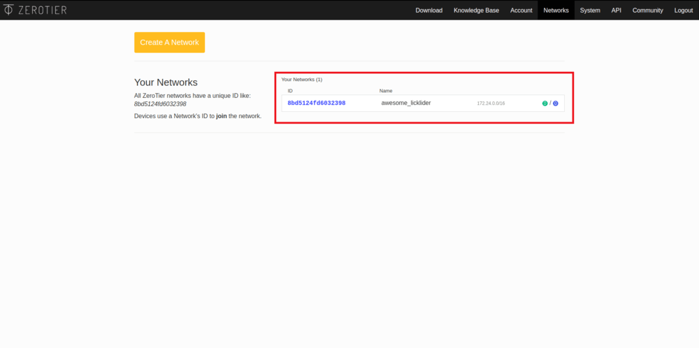 После этого вы увидите созданную вами сеть, ее ID и название. Для настройки сети нажмите на нее.
