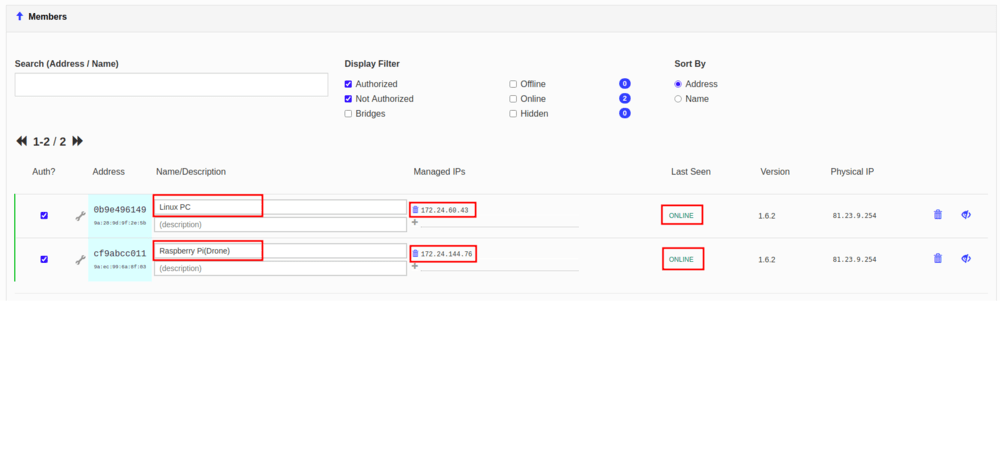 Убедитесь, что ZeroTier работает и имеет соединение с сетью на дроне и управляющем устройстве. Для этого убедитесь, что интересующие вас устройства имеют статус Online.